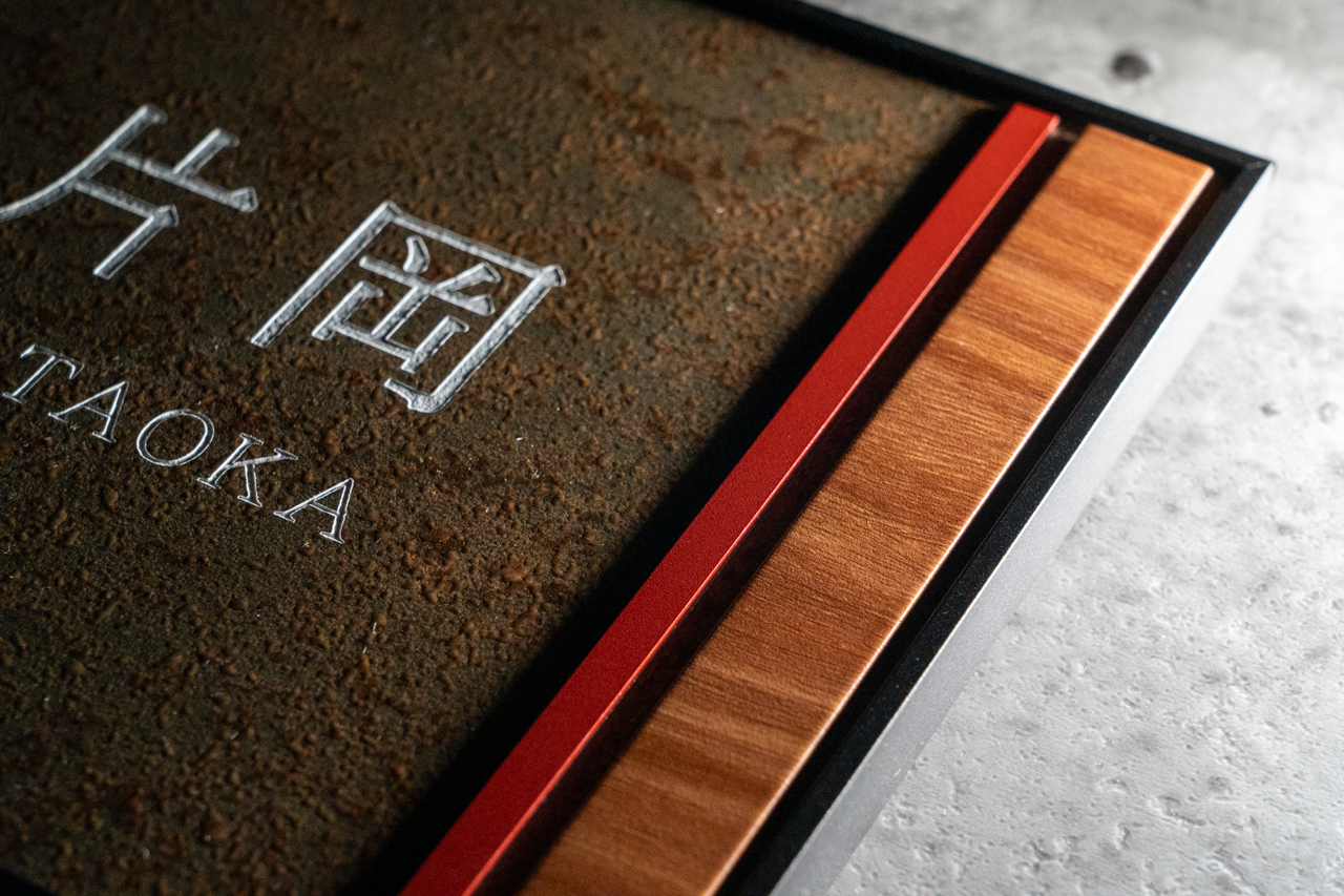 重厚感のあるアルミフレーム、リアルな質感のタイルと真鍮のプレートを組み合わせたサイン。