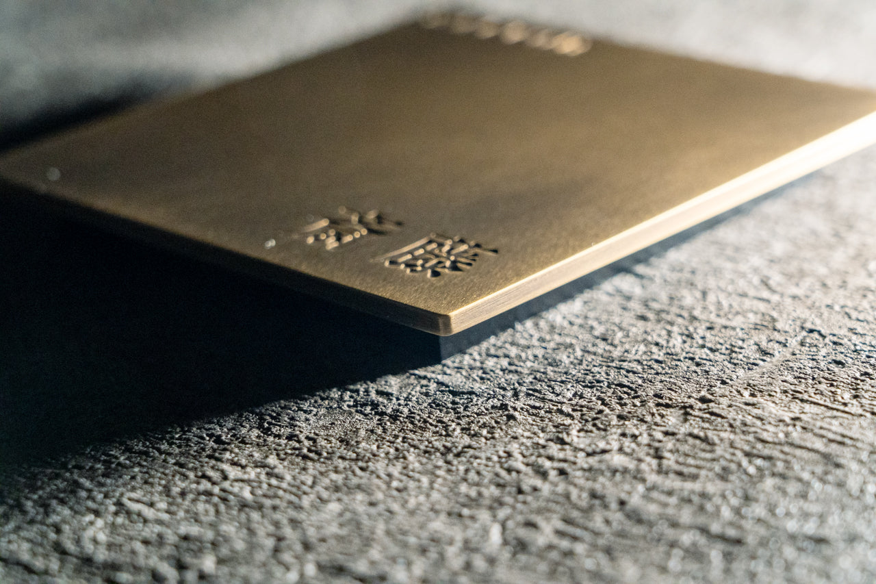 レトロな雑貨のようなくすんだ質感の真鍮プレート。あえてムラのある色合いの表面に仕上げることで素材の奥深さを表現。真鍮特有の経年による変化もお楽しみいただけます。贅沢な3mm厚で重厚感もたっぷり。文字部分は、腐食剤により溶解侵食・食刻することで印字。印字部分には窪みが生まれます。
